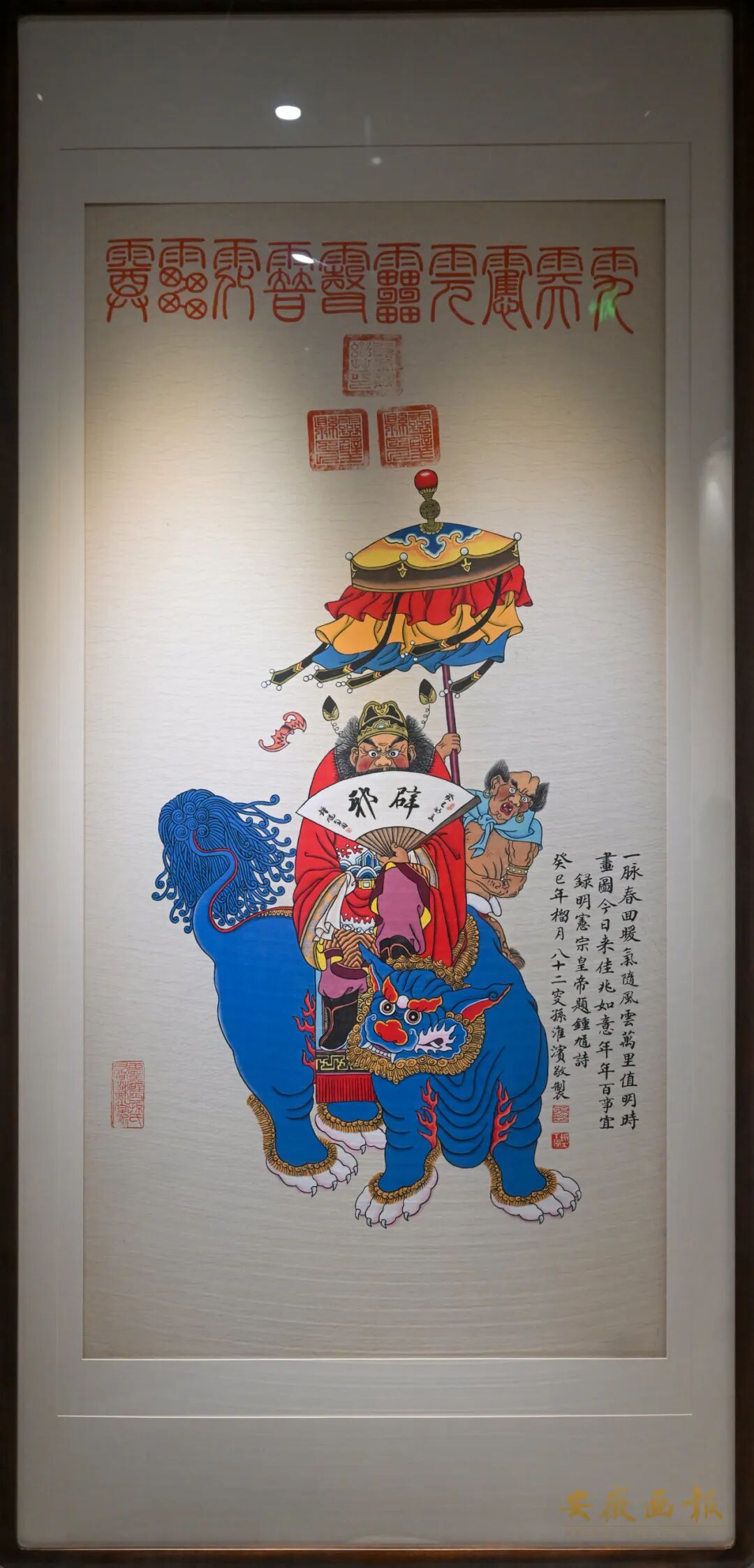 这份独特的艺术魅力,让灵璧钟馗画早早走出了国门。1915年,灵璧民间画师翟光远创作的《钟馗神威图》,代表中国民间传统艺术亮相巴拿马万国博览会,一举斩获金奖——这枚沉甸甸的奖牌,不仅让灵璧钟馗画蜚声海内外,更让世界看到了中国民俗艺术的深厚底蕴。而灵璧钟馗画还有一个标志性的“身份认证”:画作上方会加盖三方品字形的灵璧县印。这一传统始于明代,当时灵璧钟馗画作为贡品送入宫廷,县印既是防伪的标志,也是“皇家认可”的等级象征,沿用至今,成为灵璧钟馗画独有的 “文化印记”。
