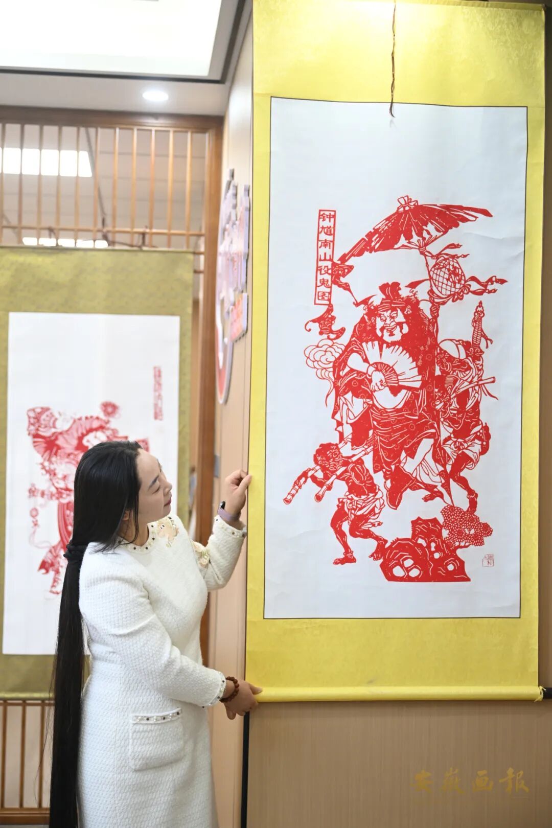李文与钟馗文化的缘分,始于童年时舅舅笔下的钟馗画。长大后,她没有局限于绘画,而是将钟馗元素融入剪纸艺术,成为灵璧剪纸钟馗的传承人。在她的剪刀下,钟馗有了多样的“姿态”:手持扇子的钟馗,寓意“散福、纳福”;手握利剑的钟馗,是 “驱邪避凶”的象征;而托着蝙蝠的钟馗,则承载着“祈福安康”的美好愿望。为了让更多人了解这门技艺,李文主动将剪纸课搬进了校园——在安徽灵璧师范学校、合肥师范学院、宿州学院等多所高校,她开设手工课与社团课,手把手教学生剪钟馗。《黑神话:钟馗》游戏爆火后,课堂上的学生们对“剪钟馗”的兴趣更浓了:“老师,能不能剪一个游戏里拿武器的钟馗?” 这样的提问,让李文更加坚定了传承的决心:“年轻人喜欢,这门手艺就有未来。”