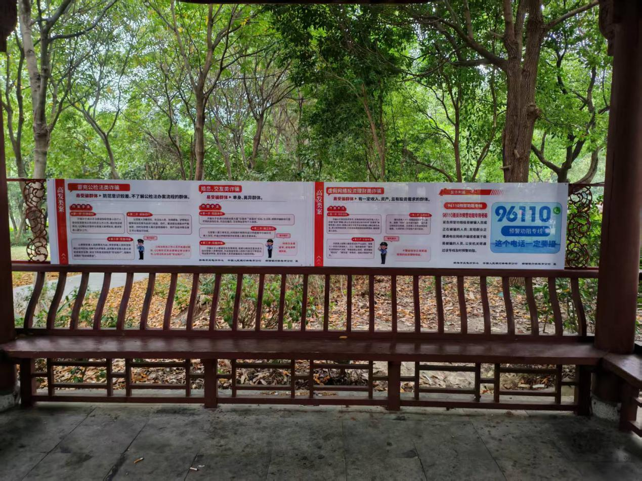 以往的反诈宣传多以社区讲座、街头传单等形式开展,覆盖人群和宣传时效有限。为打破传统模式,中国邮政储蓄银行蚌埠市分行联合蚌埠反诈中心、中国人民银行蚌埠市分行创新思路,充分利用公园人流量大、市民停留时间长的优势,将园区内的休闲凉亭升级改造为“反诈宣传阵地”。