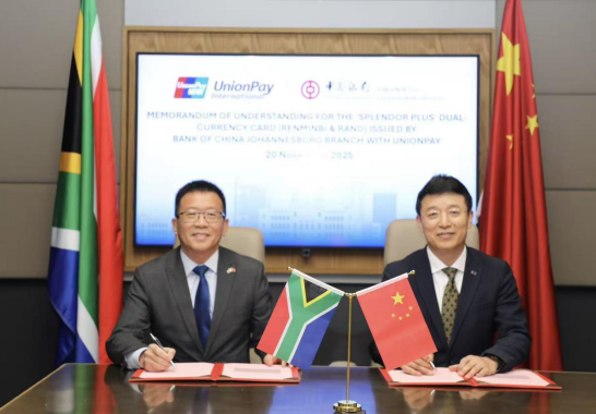 11月20日,银联国际与中国银行约翰内斯堡分行联合宣布,将在南非首次推出银联锦绣中华卡,这也是银联与中行携手在境外第11个国家和地区发行该系列卡片。在中国南非两国央行行长见证下,中国银联董事长兼银联国际董事长董俊峰与中国银行约翰内斯堡分行行长张朝阳签署合作备忘录。