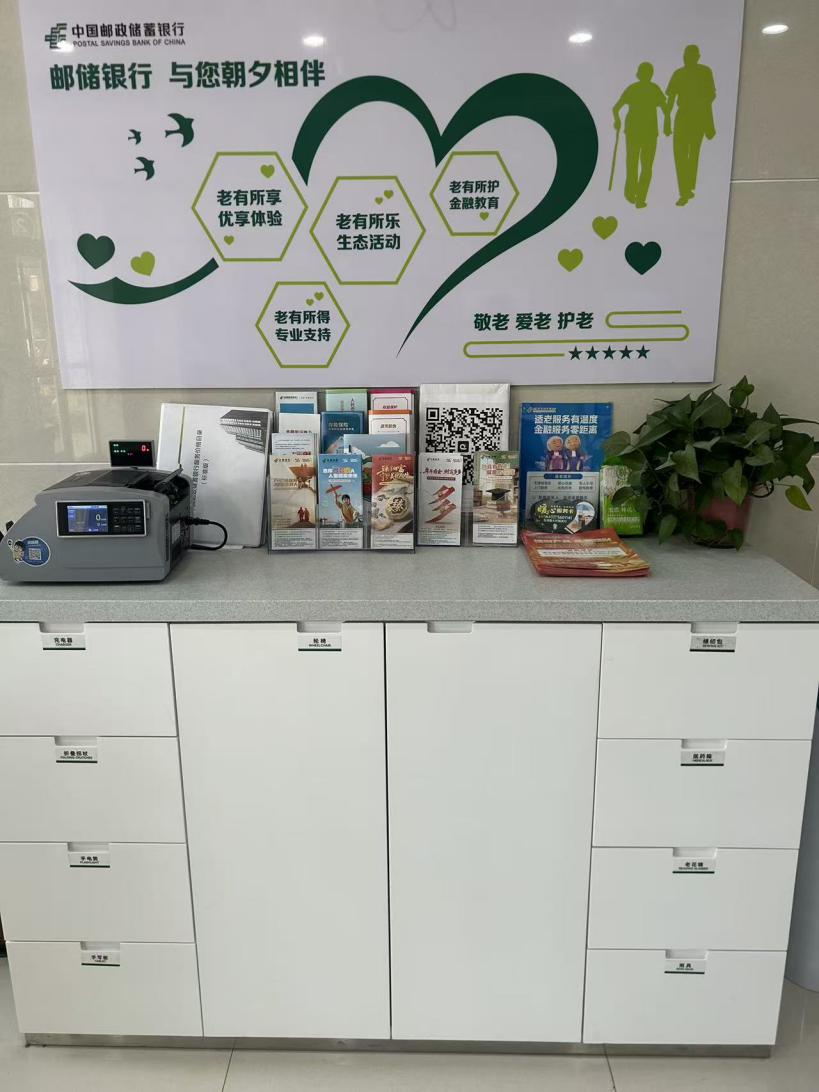 在该适老服务专区,墙面展板清晰呈现出“老有所享(优享体验)、老有所乐(生态活动)、老有所得(专业支持)、老有所护(金融教育)”四大服务方向,用直观的视觉设计传递出邮储银行小圩支行对老年群体的关怀。专区内不仅摆放了各类金融知识宣传册、适老服务指引手册,还配备了便捷的金融服务设备,让老年客户能轻松获取金融资讯、办理基础业务。同时,该网点通过划分专属服务区域、标注清晰的功能抽屉标识等细节设计,进一步降低老年客户的操作门槛,让服务更具温度。