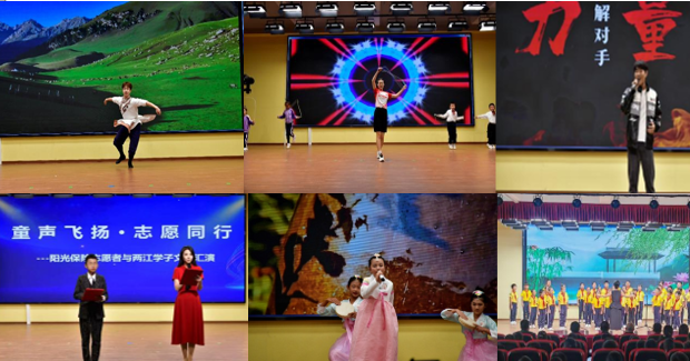 为帮孩子们勇敢迈出艺术第一步,4名特殊的“老师” 专程赶来 —— 他们是来自四川、长春、上海的“阳光少年” 评选活动中的优秀学生代表,此次以阳光保险爱心志愿者的新身份,化身 “小导师”,带领孩子练唱歌、排舞蹈、学花式跳绳、练播音主持,手把手指导,让原本羞涩的孩子渐渐放开了手脚,敢于展示自我,勇敢实现艺术梦想。活动尾声,志愿者与学校师生携手登台,在崭新明亮、动感十足的美育教室里,以一场唱歌、舞蹈交织的精彩演出瞬间点燃全场,孩子们的笑声与掌声在教室里久久回荡。