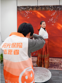 活动现场氛围热烈又温馨。摄影师志愿者们早早到岗,提前布置好拍摄背景。面对每一位来参与的老人,志愿者们都格外有耐心。为了让老人拍摄时呈现最好的状态,他们会先和老人聊几句,了解老人的喜好和气质,再据此帮忙设计合适的造型,贴心地整理服饰细节。让老人们以最佳的精神状态面对镜头,留下满意的照片。