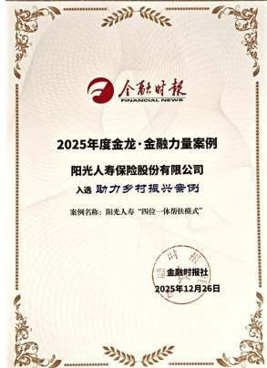 12月26日,金融时报社正式公布2025年度金龙·金融力量案例评选结果,阳光人寿申报的《阳光人寿“四位一体帮扶模式”》案例凭借在乡村振兴领域的创新实践与突出成效,成功入选案例名单,彰显了保险企业以金融力量赋能边疆发展的责任与担当。