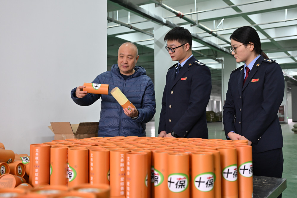图为税务干部在明光市艾之健药业科技有限公司了解企业产品销售情况。(牛涛 记者 胡昊 文/图)