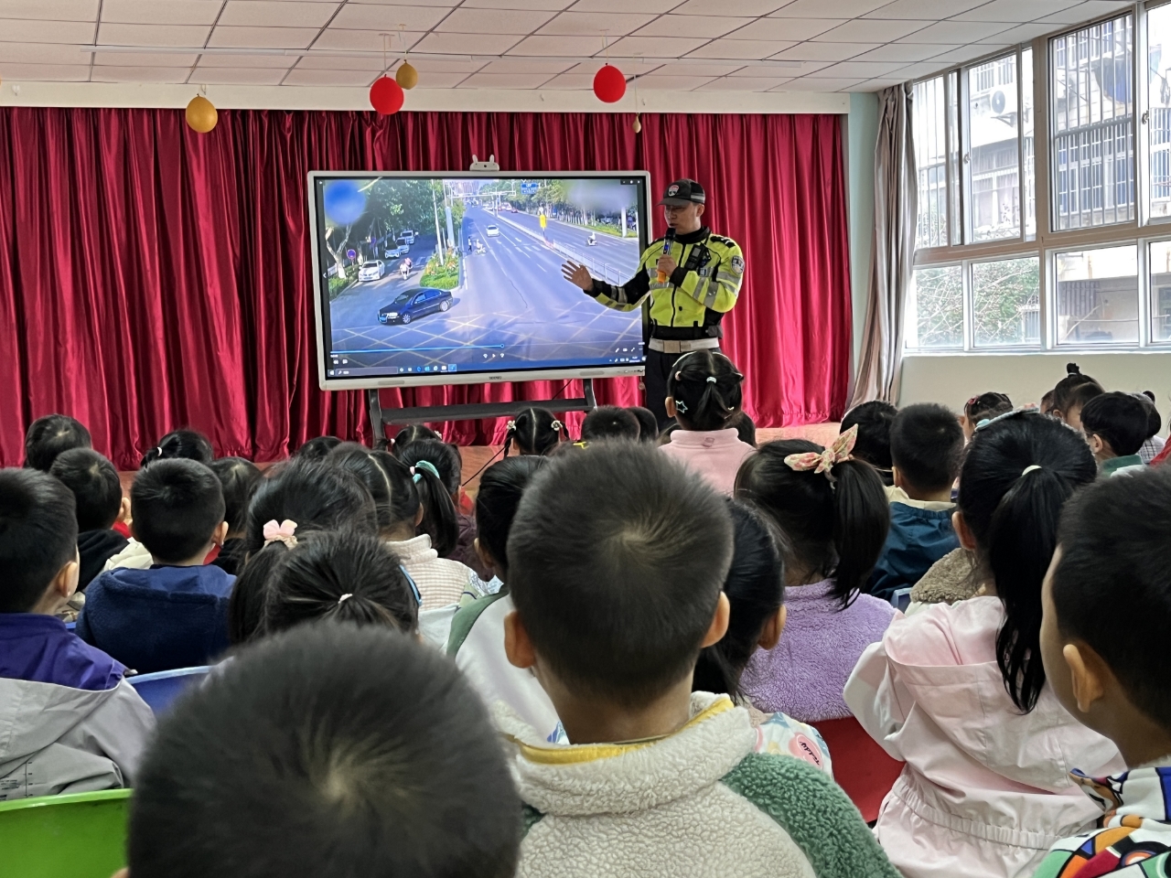 活动中,交警叔叔通过发放宣传单页、播放幻灯片的方式,从安全过马路、排队坐公交、骑车须戴头盔等几个方面,给孩子们讲解了交通安全知识,引导孩子们从小树立文明交通意识,遵守道路交通法律法规,远离交通事故伤害。