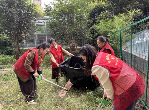 活动中,女性志愿者们身穿红色志愿马甲,手持扫帚、垃圾夹等工具,对小区绿化带内的枯枝落叶、卫生死角的杂物垃圾进行集中清理。大家分工协作:有的弯腰捡拾草丛里的纸屑杂物,有的将堆积的枯枝装入垃圾袋,有的配合物业人员清运垃圾……从单元楼周边到公共绿地,志愿者们不放过任何一处细节,用实际行动为家园“焕新颜”。