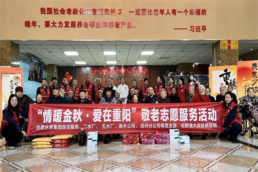 10月29日上午,合肥水务集团综合服务、二水厂、五水厂、原水公司、经开供水分公司多支部携手走进合肥市蜀山区光明老年护理院,开展“情暖金秋・爱在重阳”敬老志愿服务活动,以真情服务与专业保障为老人送去节日温情,用国企担当续写尊老敬老的时代篇章。