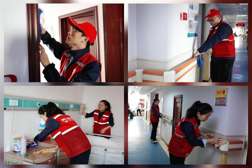志愿服务传递温情。志愿者清扫组手持扫帚、抹布,不仅扫净公共活动区地面,还蹲身擦净座椅扶手灰尘、弯腰清走走廊墙角杂物,甚至伸手抠出窗台缝隙里的碎屑,全力为老人打造一尘不染的居住环境;保障组带着检测仪、扳手等工具,逐一对食堂、宿舍的供水管道排查,测水质安全、查水龙头接口松动情况、核水表运行状态,发现一处管道轻微渗水后,当场用备件修补妥当,用“水务人”的专业守护老人们的用水安全和生活质量。