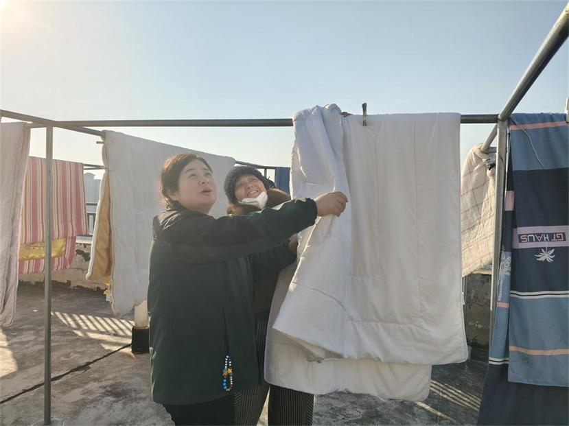 除了地面改造,小区物业还聚焦业主诉求,对小区所有楼栋的顶部进行了晾晒改造:原来楼上都是拴各色绳子晾衣服,风一刮就掉, 现在物业统一规划后,在所有楼栋的东边西边都装设了统一晾衣区,方便业主晾晒。同时也安装了监控,万一有收错衣服的纠纷,都能看得清清楚楚。