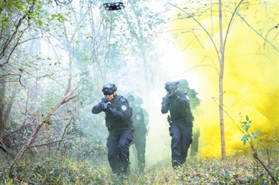 演练现场直面真实野外挑战,在丛林与山地构成的复杂地形中,特警队员全副武装,借助无人机与搜救犬的精准配合,迅速锁定“目标”并完成处置。