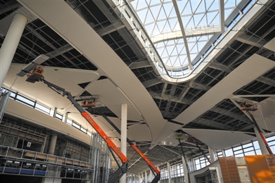 12月9日,在安徽合肥新桥国际机场T2航站建设现场,安徽建工集团施工人员正在航站楼进行装修作业。合肥新桥国际机场T2航站楼建筑面积约37万平方米,是T1航站楼的3倍多。T2航站楼建成后,通过地下、空中双层步行系统,将真正实现融航空轨交为一体的枢纽网络。