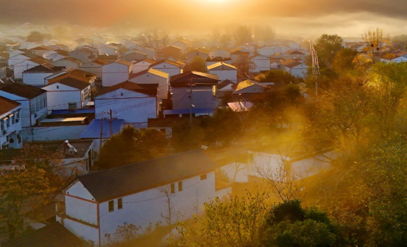 2025年11月25日,安徽淮北市杜集区矿山集街道南山村,晨雾缭绕,山林色彩斑斓,房屋错落有致,构成一幅绚丽缤纷的山村画卷。(刘棋 摄)
