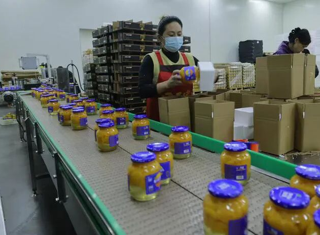 安徽爱泽供应链管理有限公司工人在将水果罐头装箱。记者 苏洋 摄