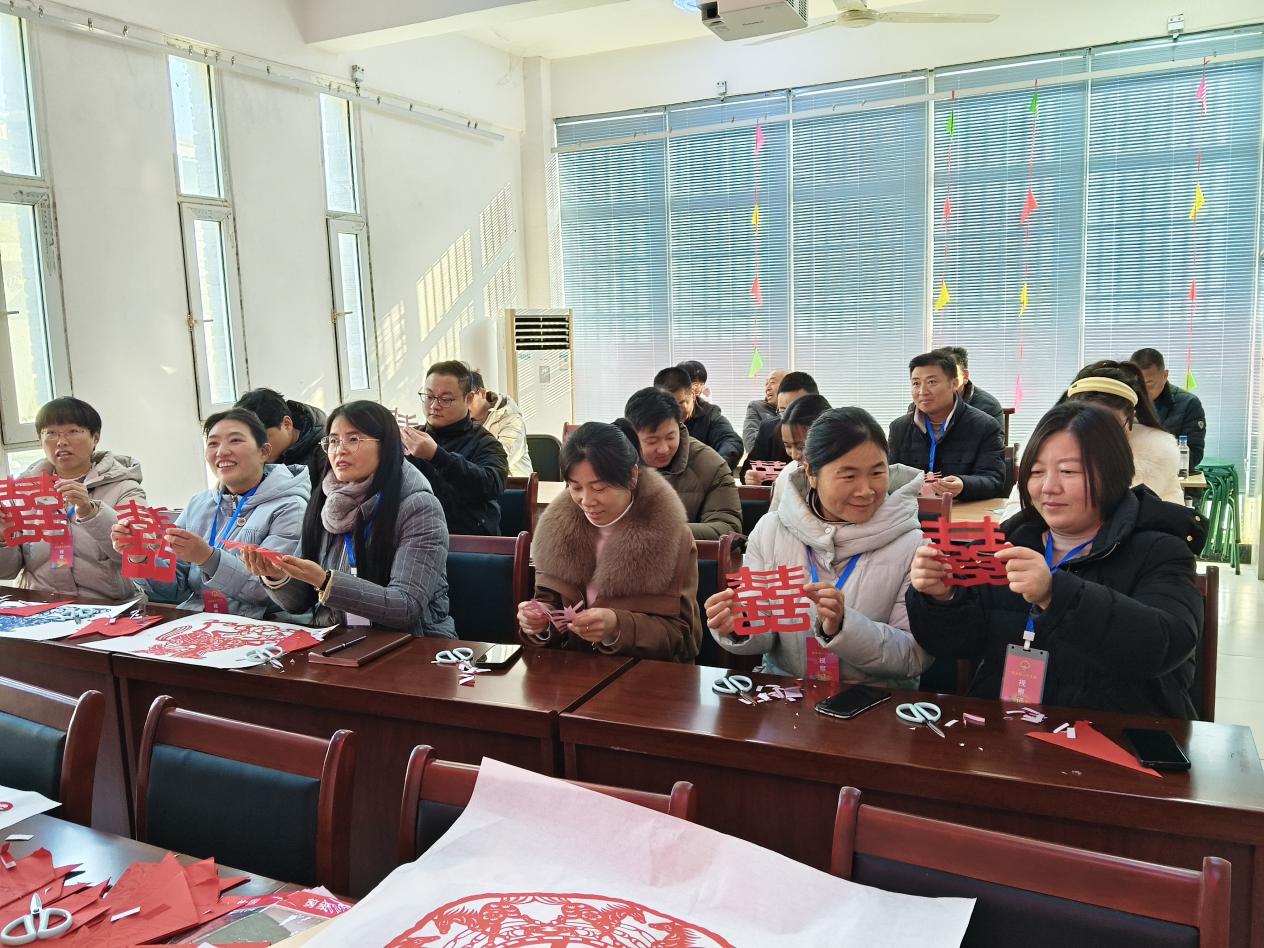 活动现场,非遗传承人用朴实亲切的乡音,讲述着剪纸艺术在乡间代代相传的故事与技巧。从纸张的折叠方式到纹样的设计寓意,细致地讲解让参与者对这项古老艺术有了更深刻地理解。在老师的亲自示范和耐心指导下,大家纷纷动手实践。只见剪刀在红纸间灵活游走,纸屑如花瓣般轻盈飘落。不一会儿,寓意吉祥圆满的“喜”字、充满欢庆气息的“元旦”字样,以及各式富有创意的图案便逐渐显现,栩栩如生。