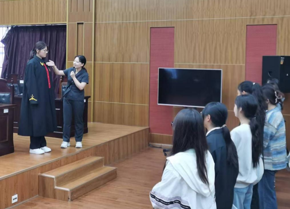 “大家可以试着穿上法袍,感受这份职业的庄重。”在刑事审判法庭内,工作人员拿起法袍、法徽,细致讲解其设计理念与象征意义。同学们争相上前,亲手触摸法袍的纹理,戴上法徽拍照留念,眼神中满是对法律职业的敬畏与向往。