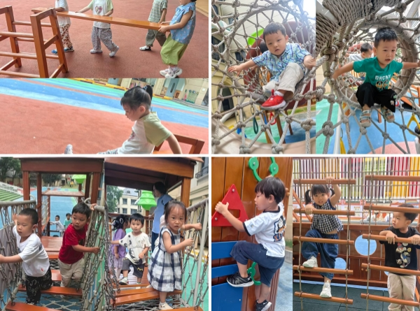 除了滑梯,臂力拉伸、走索桥、穿长龙、向上攀爬也是我们喜欢的游戏。