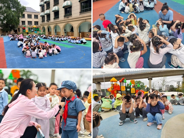 警钟长鸣,勿忘国耻。为增强全体师生的国防观念和应急避险能力。合肥市直属机关幼儿园总园及鹤琴分园分别于2025年9月18日上午9:18分开展了“九一八”防空安全演练活动。