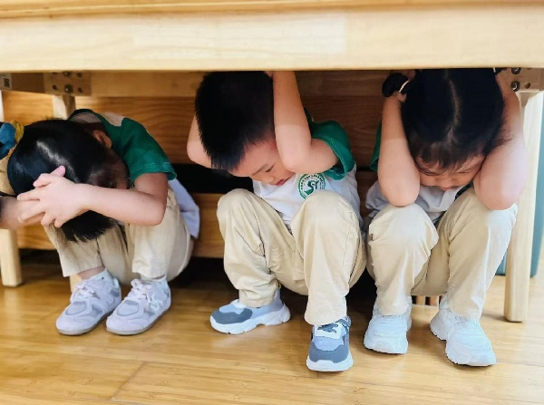 随着第一声预警警报声拉响,各班老师立即组织幼儿行动,孩子们迅速放下手中物品,双手紧紧护住头部,有序躲到桌底、墙角等安全区域,整个过程紧张而有序。