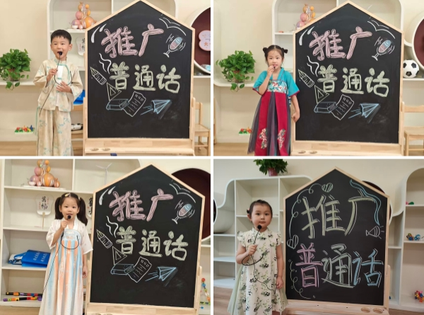 为营造“人人说普话,处处见规范”的语言环境,幼儿园精心布置校园。走廊的推普海报色彩明快,教室的标语牌童趣满满,“说普通话,做文明娃”“普话连你我,快乐共成长”等话语时刻提醒着师幼,让规范用语的意识在潜移默化中深入童心。