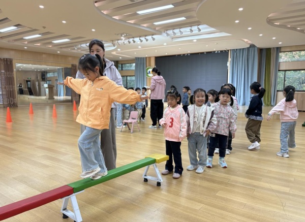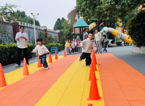 秋阳和暖,园内处处跃动着蓬勃朝气。平衡木项目中,幼儿目光专注、双臂微展,如雏鸟初试振翅,虽步履稚拙却稳扎稳打,在摇晃中学会控制,在坚持中收获勇气。双脚连续跳场地上,孩子们化身灵动的“小袋鼠”,双脚轻巧点地、节奏分明,每一次腾跃都是对协调性与爆发力的双重考验,汗水与笑声交织成成长的序曲。