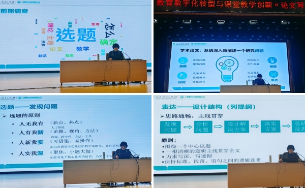 随后,她聚焦“人工智能时代数字化教学论文的选题与写作规范”,结合案例与方法论,拆解论文写作核心要点。选题环节,李老师结合“前期调查”关键词云图,直观呈现教师选题困惑,提出“人无我有、人有我新、人新我实、人实我深”的选题原则,从新点挖掘、视角创新到成果深化,为教师打开选题思路。