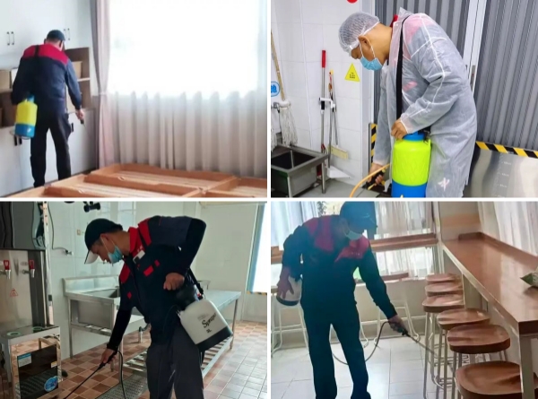 由专业的消杀人员对幼儿园内各项设备设施以及食堂、教学楼等逐层进行喷洒消杀。