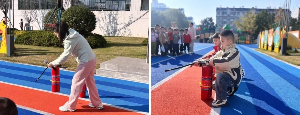 疏散结束后,为了让孩子们更直观地认识消防器材,李老师在操场中央向全体幼儿讲解并演示了灭火器的正确使用方法,并邀请幼儿参与实操体验。孩子们在“听讲解、看演示、动手试”中深化理解,将理论知识转化为真实技能。