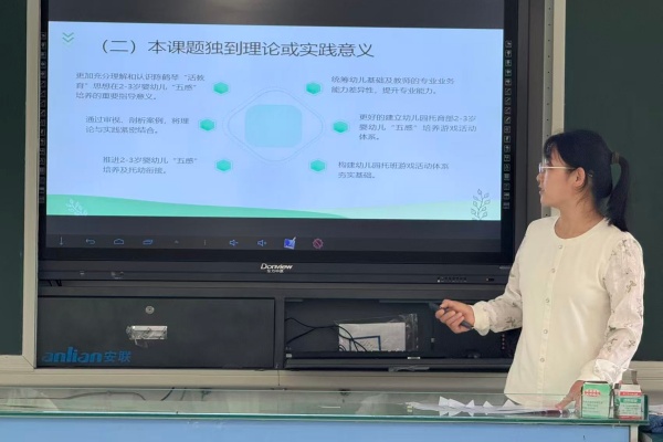 论证会邀请了合肥大学教育学院党委书记刘红、幼教专家正高级教授方明惠担任评审专家,课题负责人朱晨曦及核心研究团队成员参与汇报与研讨。会议伊始,课题组核心成员大杨融悦幼儿园业务负责董欣灏园长从选题依据、创新之处、参考文献、预期成果、研究基础等方面进行详细阐述。该课题立足2-3岁婴幼儿感官发展关键期,以“活教育”理论中“大自然、大社会都是活教材”为指导,聚焦视觉、听觉、触觉、嗅觉、味觉的协同发展,拟开发一系列本土化、生活化的“五感”游戏活动案例。