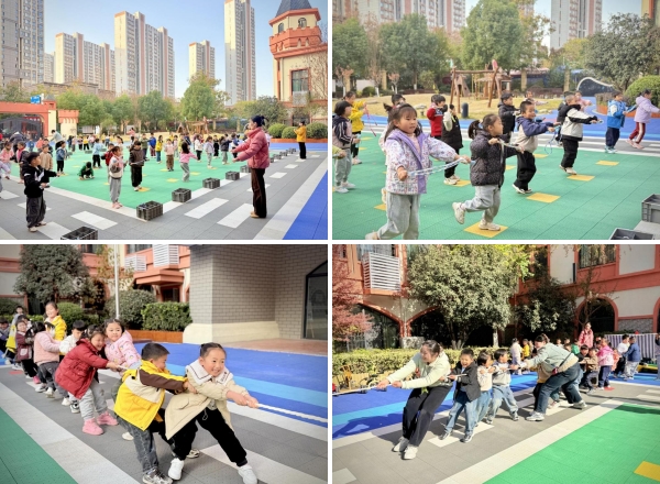 活动伊始,活力绳操拉开序幕。师幼伴随欢快旋律,将跳绳融入伸展、跳跃等动作,在轻松愉悦的氛围中充分激活身体活力。随后开展的绳子拔河游戏,让幼儿在趣味互动中感受合作的快乐,进一步挖掘绳子的多样玩法,体验运动乐趣。