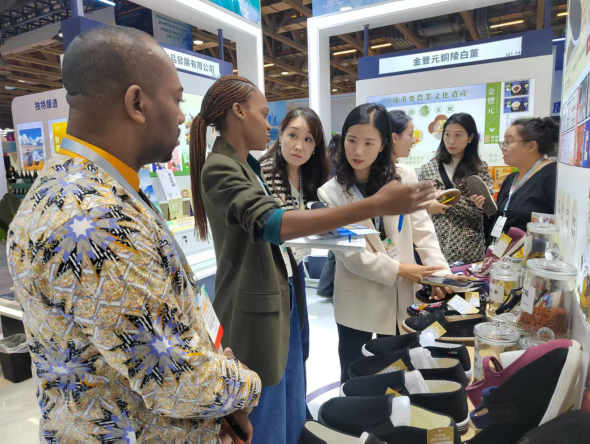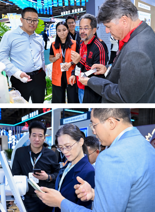 安徽展馆紧扣“皖链中外•智创未来”主题,巧妙融合现代科技感与徽文化元素,布局简约而富有内涵。展区汇聚了全省多家科创“专精特新”企业与非遗工艺代表。合肥云诊信息科技有限公司的“AI+中医”产品、安徽中科医疗器械有限公司的智能医疗设备,展现了安徽在智慧健康领域的科技实力;中国宣纸股份公司、黄山徽州竹艺轩雕刻有限公司、芜湖储氏铁画工艺品有限公司等老字号与非遗传承企业,则通过宣纸、竹木雕、铁画等工艺精品,向世界展示徽文化的深厚底蕴。大健康与绿色食品板块同样引人注目,安徽协和成药业饮片有限公司、安徽斛生记生物科技有限公司、池州市九华府金莲智慧农业有限公司等企业带来的中药饮片、霍山石斛、黄精系列产品,彰显出安徽在中医药与绿色农业领域的融合创新与产业活力。