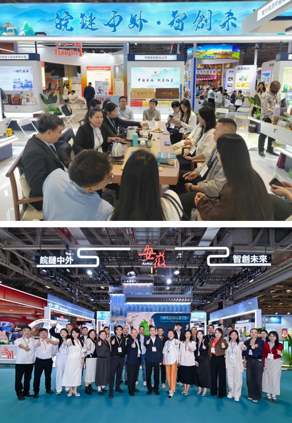 安徽代表团在团长杨正的带领下,积极参与开幕式、巡馆等多项重要活动,并与各方嘉宾深入交流。为进一步推动务实合作,代表团与中国贸促会驻澳门代表处、澳门招商投资促进局、中葡论坛常设秘书处、中葡文化促进会、澳门安徽联谊总会、澳门南光集团、澳门中药业公会等机构,围绕皖澳经贸合作、中医药与绿色食品标准互认、借助澳门平台对接葡语国家市场等议题展开深入探讨,为后续项目落地奠定基础。此外,安徽馆成功举办“中国(安徽)与葡语国家代表团馆际交流活动”,邀请澳门及葡语国家展团代表与我省企业面对面洽谈。巴西、葡萄牙等多家展商对安徽高新技术产品表现出浓厚兴趣,高效务实的对接平台助力现场交流热烈,成效显著。