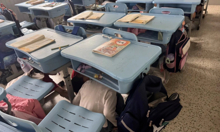 紧急避险环节,各班学生在班主任的指挥下,迅速停止课堂活动,双手抱头、弯腰下蹲,躲至课桌下方,避免暴露在窗户、门口等危险区域,整个过程安静有序,无慌乱现象。