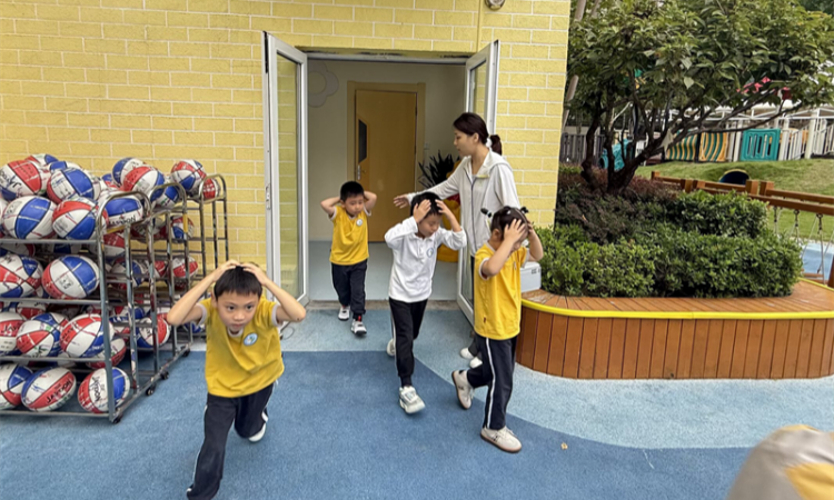 随着防空警报声再次响起,各班级教师迅速行动,按照预定疏散路线,引导幼儿用双手护头、弯腰低姿,快速且有序地撤离活动室。过程中,教师时刻关注幼儿安全,提醒幼儿不推挤、不慌乱,短短几分钟内,全体师幼便安全疏散至园区操场指定安全区域。