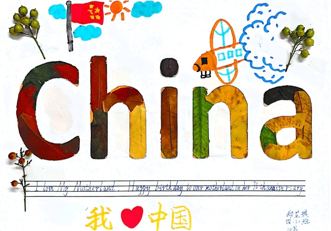 四年级以"China"为创作核心,在字母镂空框架中融入巧思。同学们根据树叶的色彩与形态分类搭配,用深绿松针勾勒字母轮廓,用橙红树叶填充内部,在拼贴中自然掌握了单词拼写。"红色树叶像国旗,绿色像森林,我们的China是彩色的!"孩子们的话语道出了创作的初心。作品中附上的"I love you, China!""You are so beautiful."等短句。