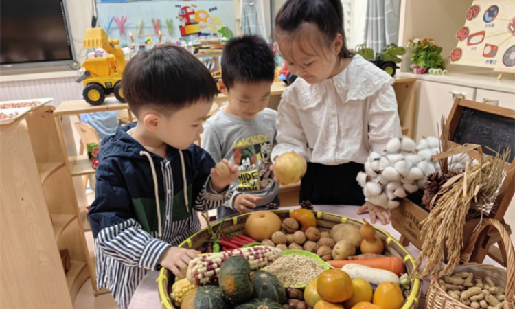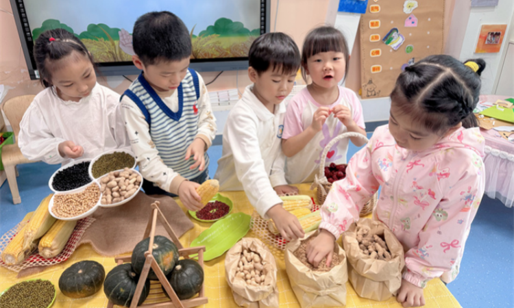 生活即教育,班级教师通过创设丰收的情境,引导幼儿认识五谷杂粮,活动中,幼儿通过看一看、摸一摸、闻一闻、说一说等多感官探索,对粮食的种类、营养价值有了更清晰地了解,同时也体会到农民伯伯粮食种植、收获的艰辛。