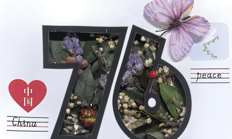 三年级以"76周年"为主题,在老师的指导下先掌握"China""peace"等核心词汇。假期里,孩子们化身"自然收藏家",捡拾金黄的银杏叶、火红的枫叶,细心压平后铺满模板。