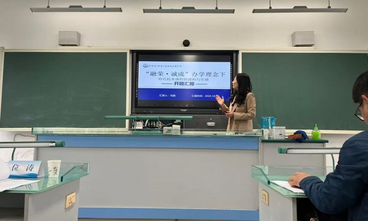 在开题论证环节,马璇围绕课题的选题依据、核心概念界定、研究目标与内容及预期成果等核心维度展开详细汇报。其研究以学校 “融荣・诚成”(融合共生、荣誉激励、诚信立身、成长导向)办学理念为文化内核,通过构建 “活动—实践” 双课程体系,创新 “文化—实践” 双向驱动的校本课程建构理论框架,弥补传统研究中文化价值引领不足的缺陷,最终实现四重实践意义:一是形成校本课程构建的标准化流程,为同类学校提供可推广的特色校本课程模型;二是搭建能力进阶路径与全方位育人体系,促进学生全面发展;三是将办学理念深度融入课程,塑造学校独特文化标识,推动特色品牌建设;四是以课程开发实施为契机,引导教师从 “课程执行者” 转向 “课程研究者”,通过跨学科教研、校本教材编写提升专业能力。
