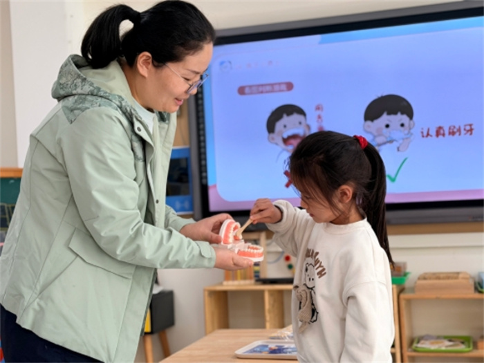 孩子们兴致勃勃,在互动中学习了如何正确刷牙,并深刻理解了少吃甜食、定期检查牙齿的重要性,将爱护牙齿的健康意识植根于每个孩子心中,实现了家园共育的美好互动。