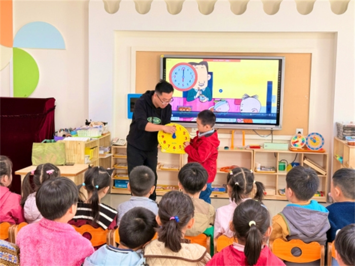 活动中子心爸爸通过巨大的实物钟盘,耐心地引导孩子们辨认时针、分针,学习“整点”概念。孩子们在听故事、动手拨指针的趣味互动中,轻松掌握了认读钟表的基础知识。本次活动不仅让孩子们初步建立了时间观念,更让他们体会到管理时间的重要性,是家园共育的又一次精彩实践。
