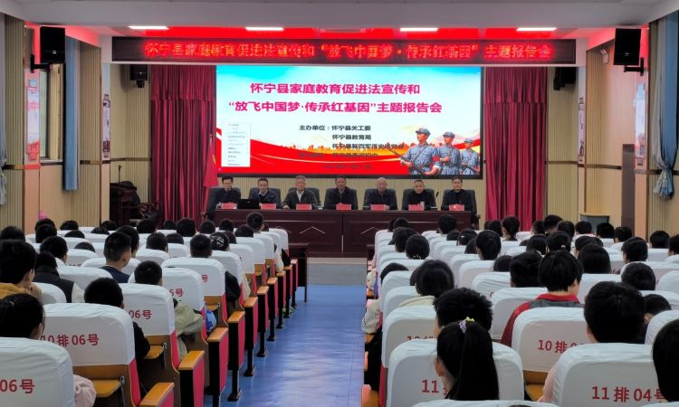 为深入贯彻《中华人民共和国家庭教育促进法》,厚植青少年红色基因,11月6日,怀宁县关心下一代工作委员会、怀宁县教育局、怀宁县新四军历史研究会联合在高河初中举行家庭教育促进法宣传暨“放飞中国梦 传承红基因”主题报告会。县关工委主任丁风生,常务副主任杨培林,副主任贾炳根,高河镇党委书记吴华,县教育局党委委员、副局长、关工委主任王根旺出席会议。