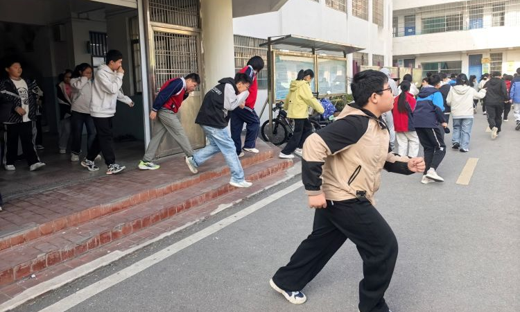 下课铃声响起,演练正式启动。全体师生迅速响应,在班主任引导下,按照预设方案,弯腰俯身、用湿巾或衣袖捂住口鼻,沿着指定逃生路线快速撤离。过程中,师生们沉着冷静、不推不挤,保持安全间距,有序通过楼道,短短数分钟内便全部撤离至校园指定安全区域。随后,各班迅速清点人数并上报演练总指挥,确保无一人遗漏。