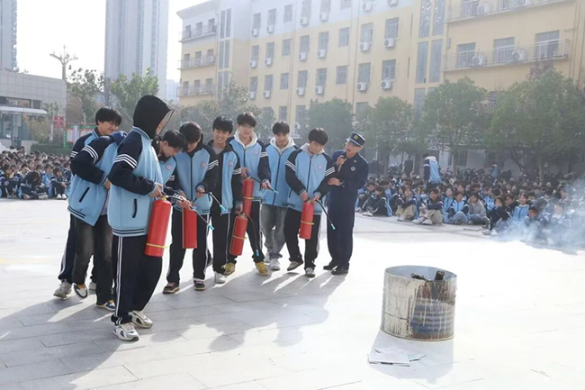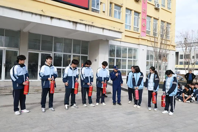 随后,消防知识实操技能培训环节拉开帷幕。砀山县消防队朱班长结合真实火灾案例,用通俗易懂的语言讲解了火灾成因、初期火情识别、疏散逃生注意事项等核心知识。随后,亲手示范了“提、拔、握、压”四字操作法。在朱班长的指导下,学生代表依次上前实操,亲手体验灭火过程,将理论知识转化为实际技能,切实掌握了初期火灾的处置方法,迅速逃生的要领。