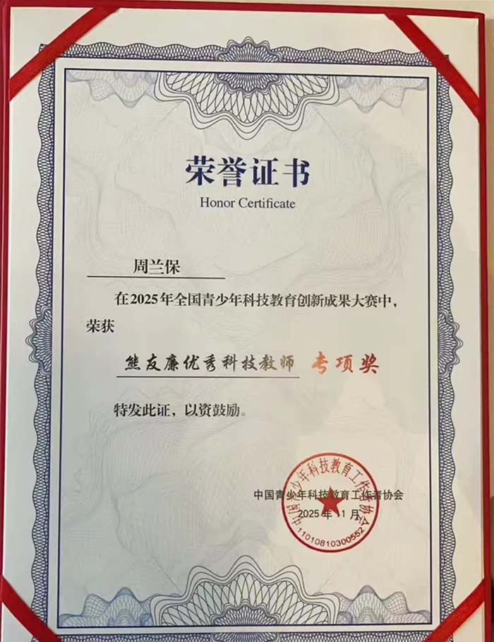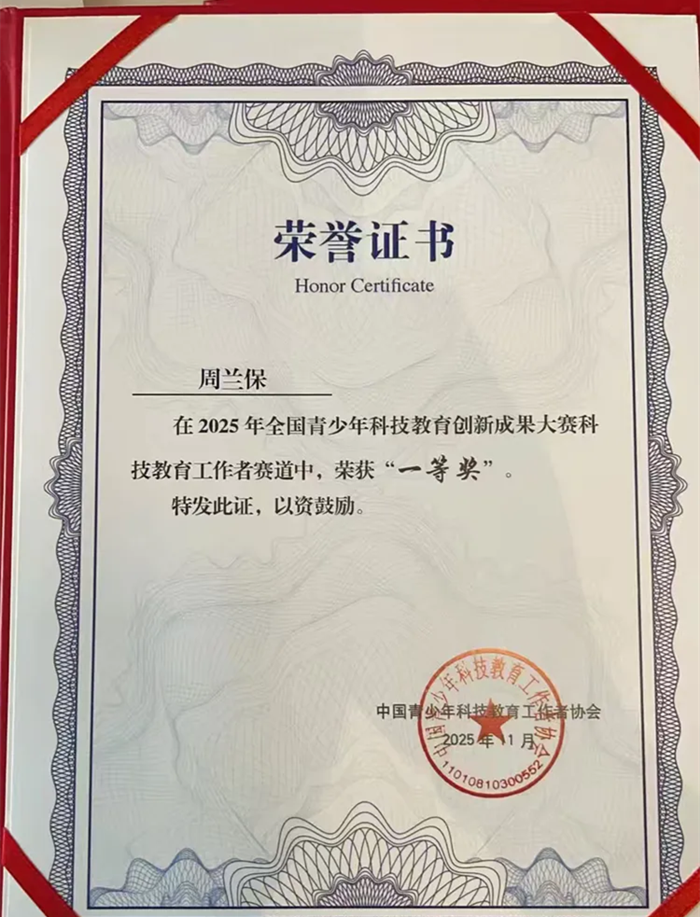 在本次全国青少年科技教育创新成果大赛中,来自全国各地的优秀科技教育工作者同台竞技,竞争异常激烈。周兰保老师凭借扎实的专业功底、新颖的教学理念以及在青少年科技教育中的丰硕成果,在“科技教育工作者赛道”中脱颖而出,成功斩获一等奖;同时,鉴于他自1985年以来扎根教学一线、四十余载全力推动青少年科技创新能力培养的突出贡献,组委会特授予其“熊友濂优秀科技教师专项奖”。