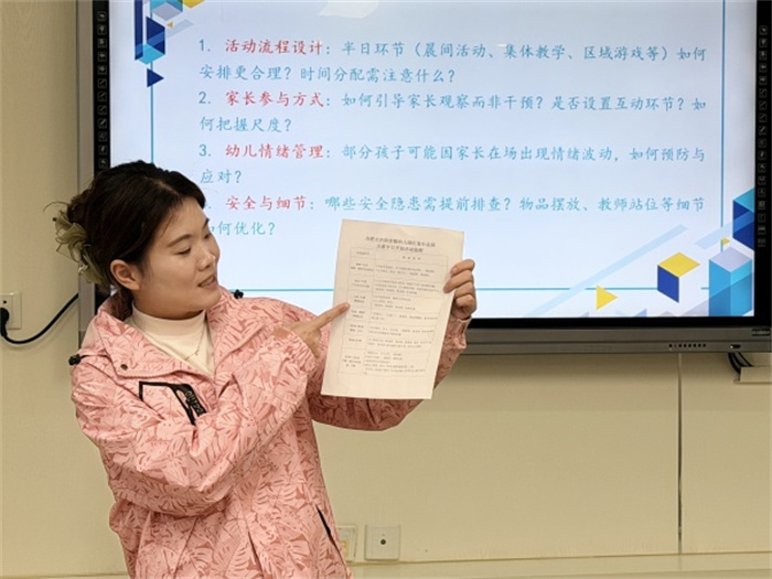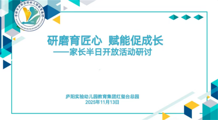为加强教师队伍建设,提升教师的专业素养,进一步优化半日开放活动的组织与内容,2025年11月13日,合肥市庐阳实验幼儿园教育集团红玺台总园围绕“有效组织家长半日开放活动”开展专题研讨。本次教研聚焦优化活动流程,深化集体教学活动设计,全面提升开放日活动质量。