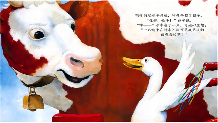 鸭子骑过母牛身边,冲母牛招了招手。“你好,母牛!”鸭子说。“哞——”母牛应了一声。可她心里想:“一只鸭子在骑车?这可是我见过的最愚蠢的事!”