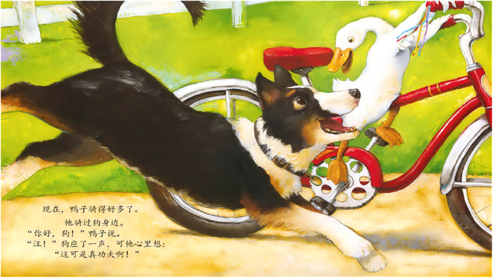 现在,鸭子骑得好多了。他骑过狗身边。“你好,狗!”鸭子说。“汪!”狗应了一声,可他心里想:“这可是真功夫啊!”