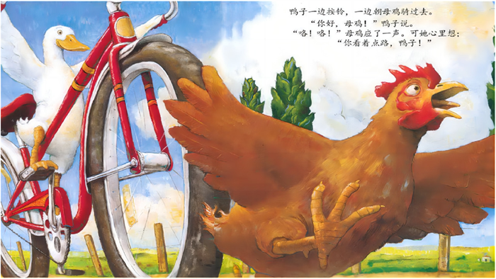 鸭子一边按铃,一边朝母鸡骑过去。“你好,母鸡!”鸭子说。“咯!咯!”母鸡应了一声。可她心里想:“你看着点路,鸭子!”