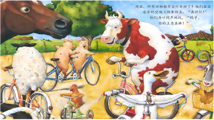 现在,所有动物都有自行车骑了!他们在谷仓旁的空地上骑来骑去。“真好玩!”他们异口同声地说,“鸭子,你的主意真棒!”