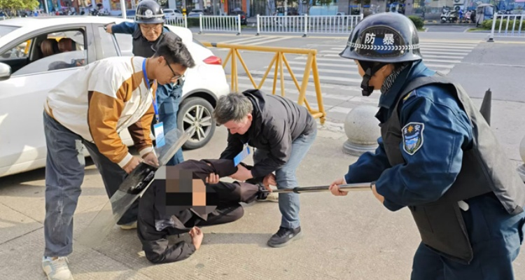 下午14:50,演练正式开始。模拟场景设定为一名“可疑人员”驾驶车辆试图冲撞校门口学生聚集区域。校门口保安第一时间发现险情,立即启动应急机制,一人迅速“一键报警”,并通过对讲机上报险情;另一组同步使用防护盾牌、防暴钢叉等装备进行前期阻拦与周旋。甘棠派出所民警与特警接警后,迅速响应,特警于1分20秒内抵达现场并实施控制;1分25秒,甘棠派出警力到达,开展交通疏导与现场秩序维护,并与学校安保人员、值班人员协同制服“嫌疑人”,有效控制了事态发展。警戒组迅速拉起警戒带、设置警示标志,封锁现场,防止二次伤害发生。
